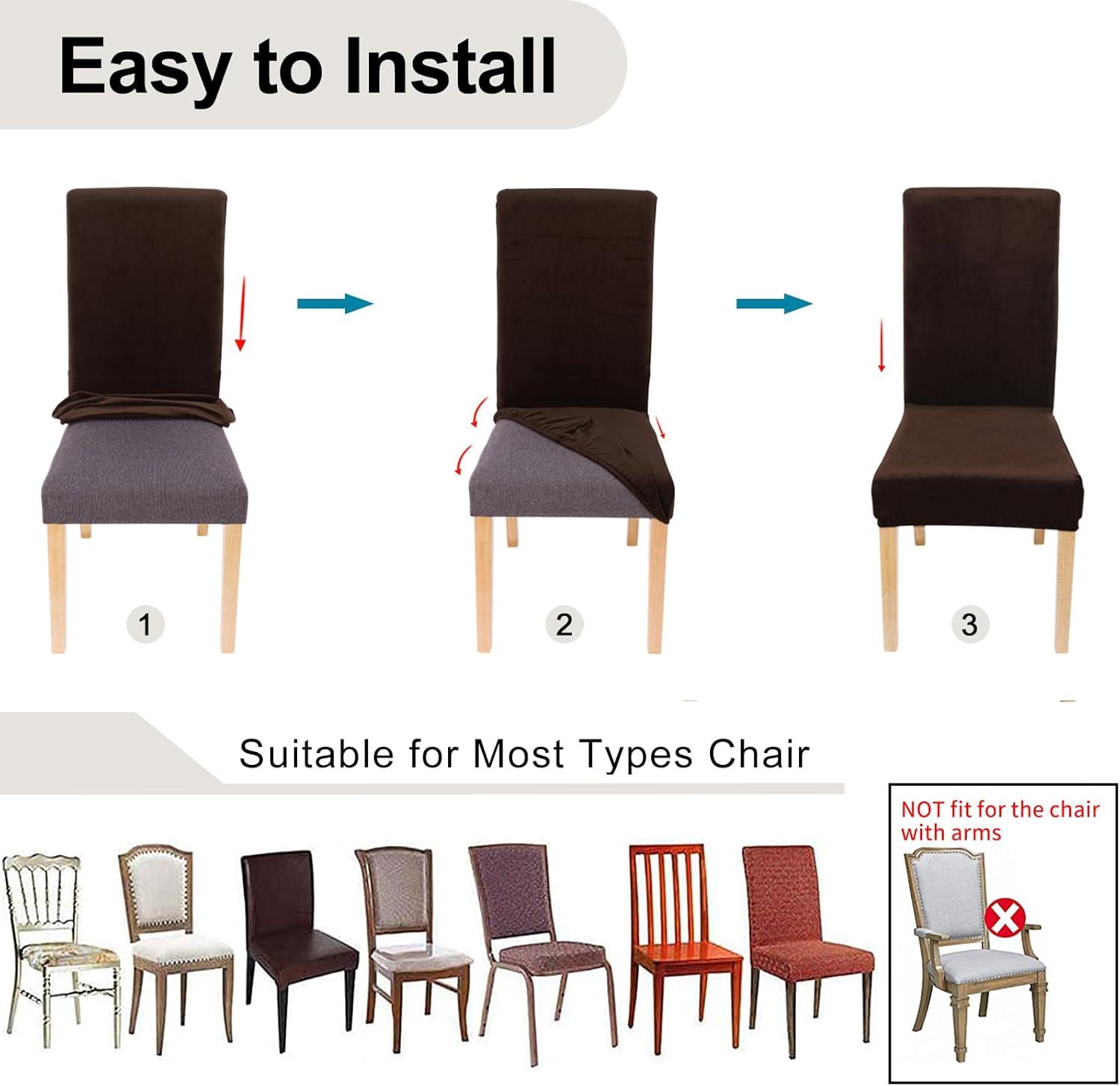 [Perfect Fit] Stretchable thick material velvet chair cover with sewn-in elastic hem ensures the dining chair covers fit securely on your chair, very easy to put on and take off. It covers the chair from the backrest to the seat, fit perfectly on most armless chairs and stay up