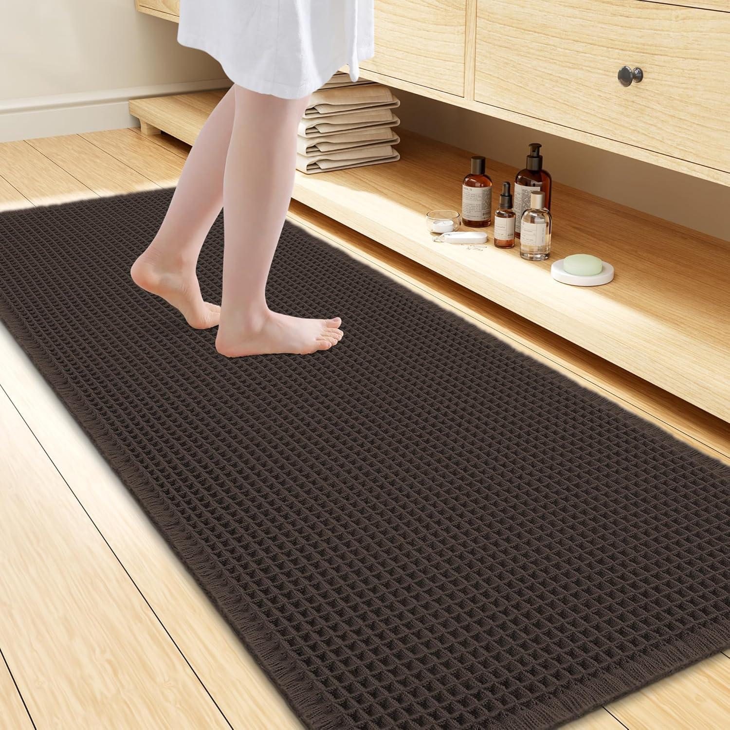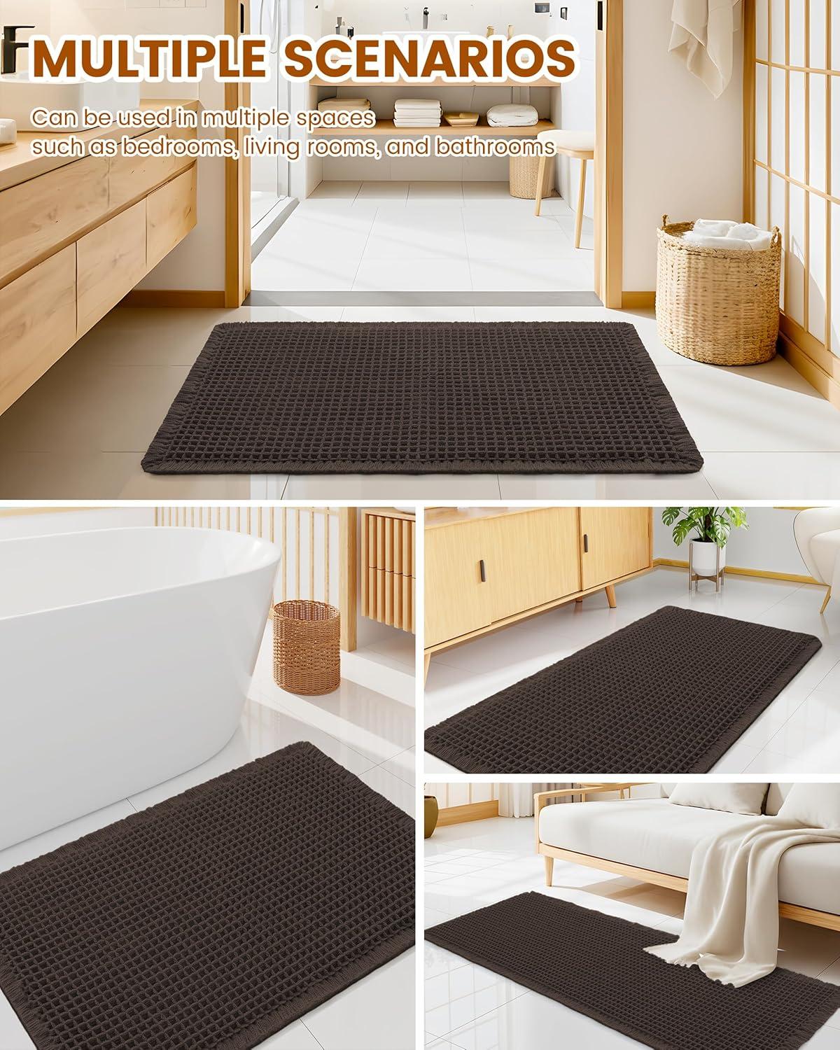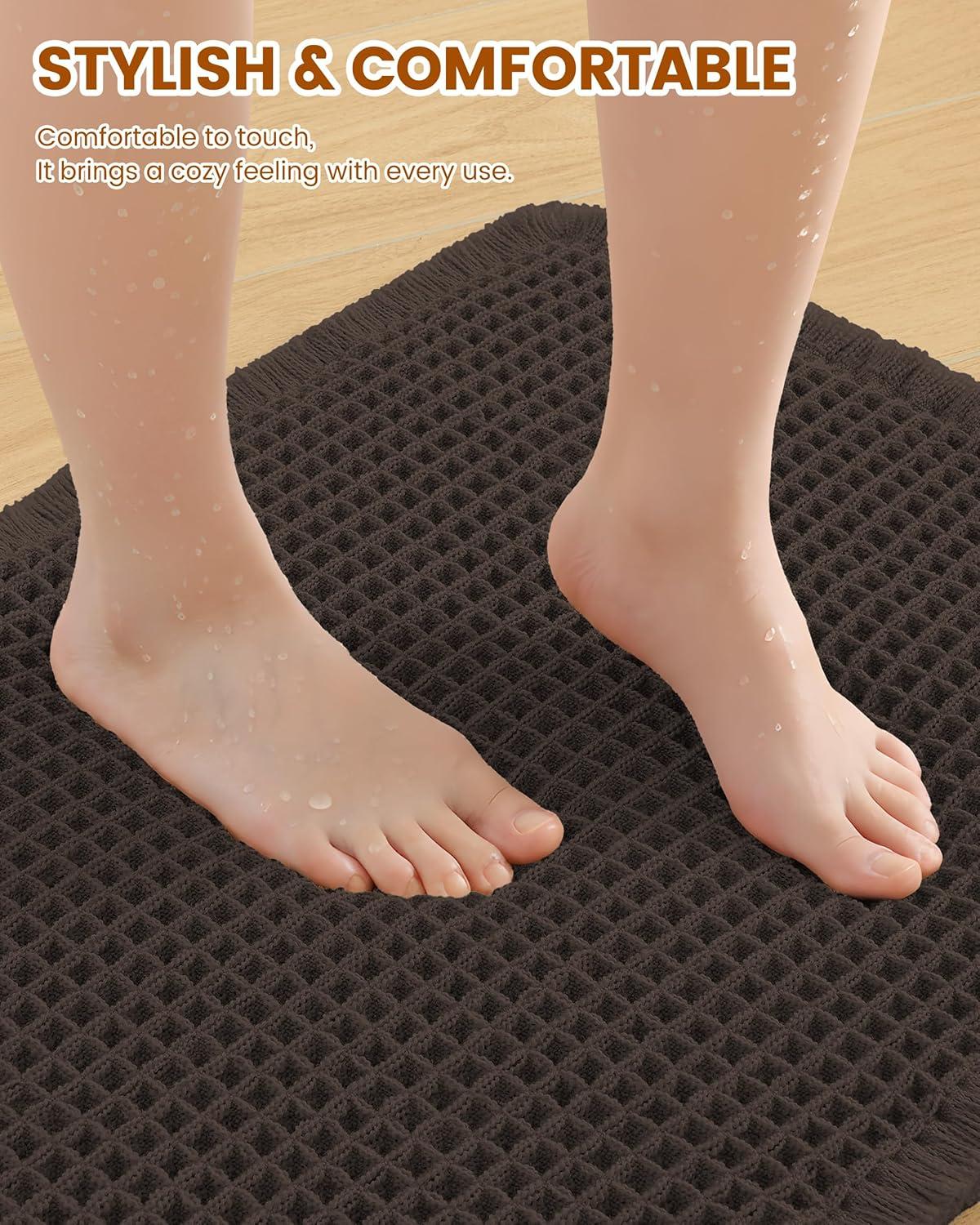[Soft & Comfortable] The moment you step on the bathroom rugs, the solid thickness of the high-weight material is instantly felt—no flimsy lightness, only steady and comfortable support. The three-dimensional waffle texture fits naturally with every movement of your feet, gently wrapping every inch of your soles, making every step both stable and utterly cozy.