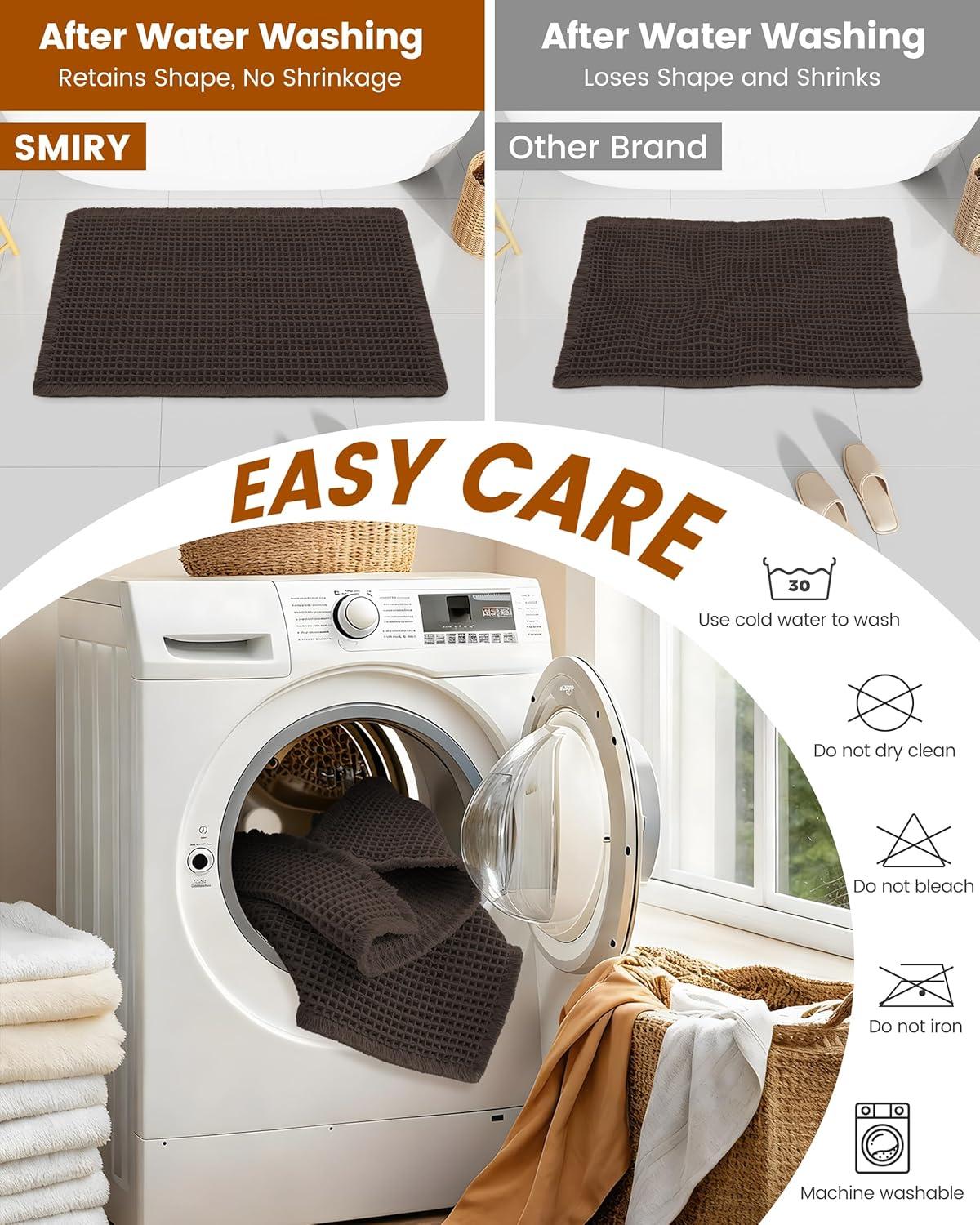 [Easy to Clean & Care] Machine wash on a gentle cycle with cold water for the best. After cleaning, air dry naturally or tumble dry on low heat. For simple daily maintenance, just shake the bath rugs by hand to remove dust, which will help maintain its non-slip properties.