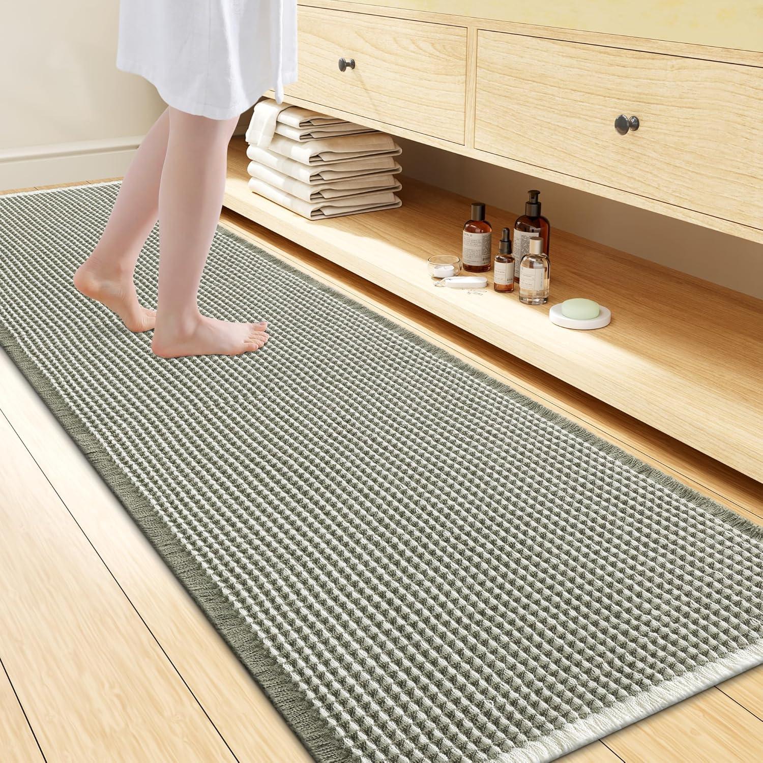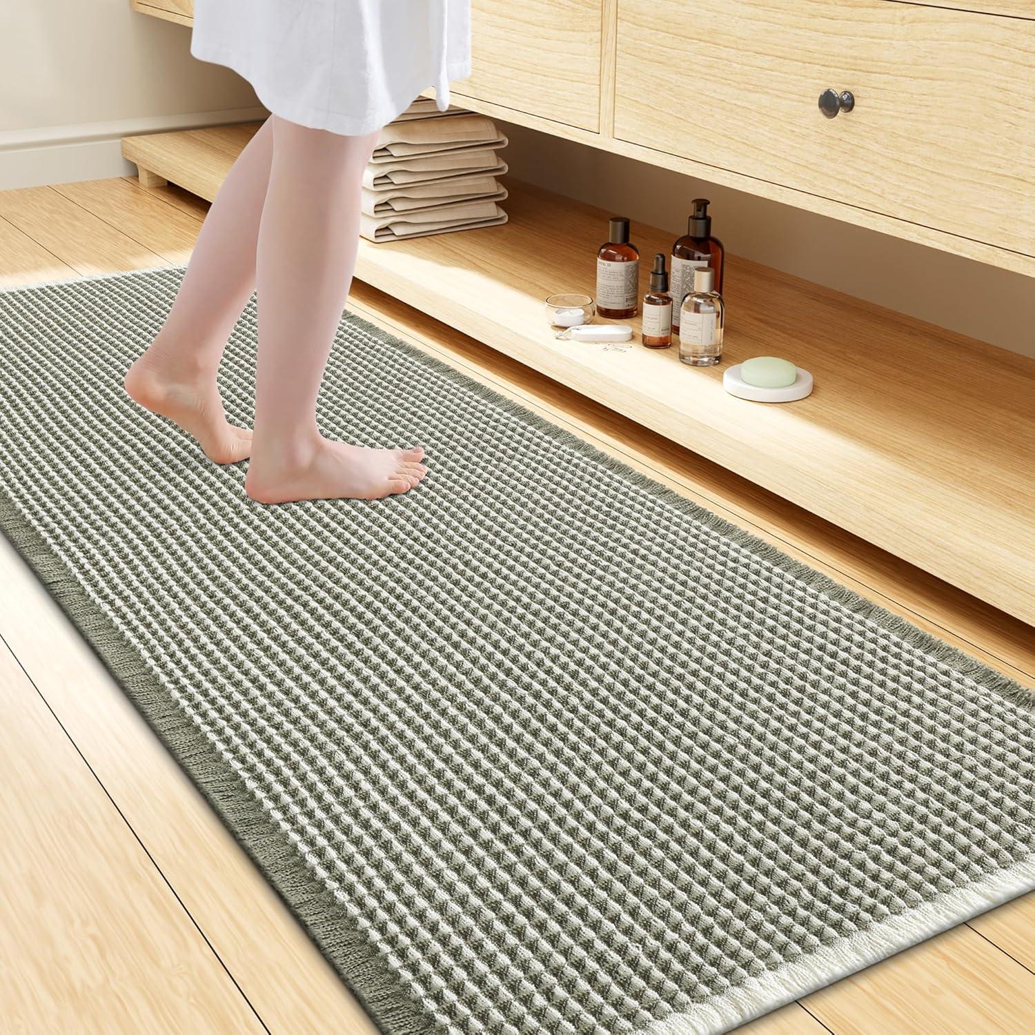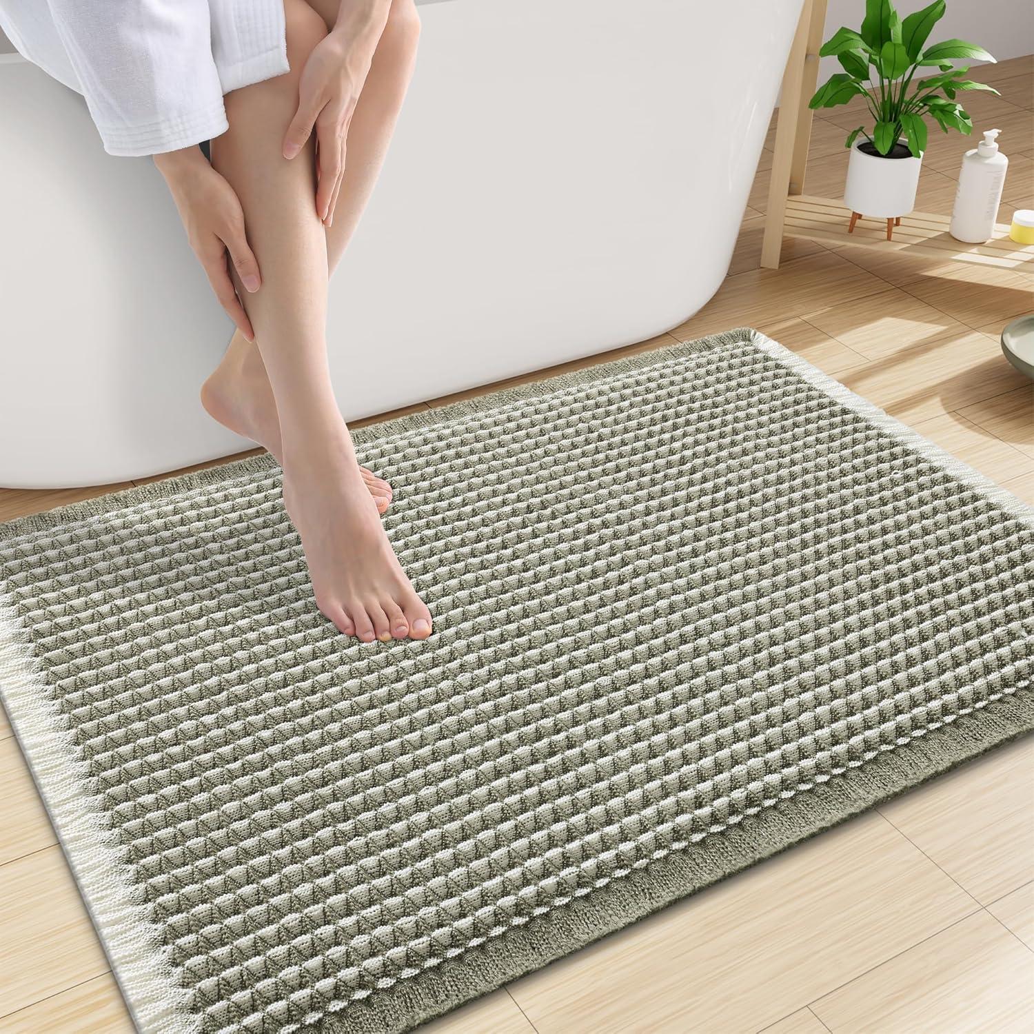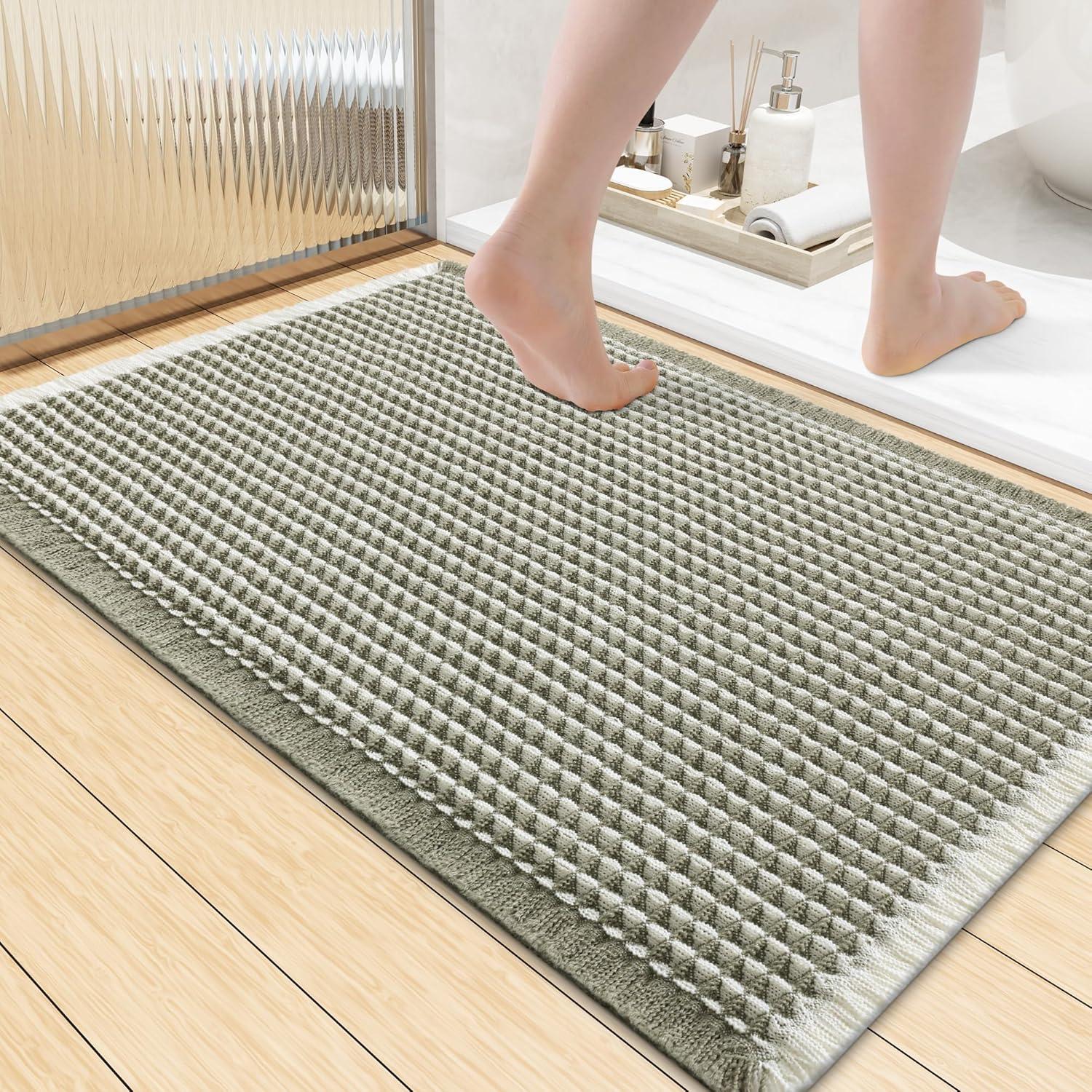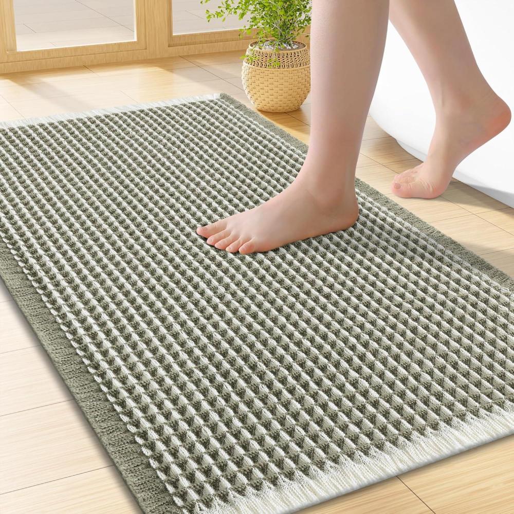 [Soft & Comfortable] The moment you step on the bathroom rugs, the solid thickness of the high-weight material is instantly felt—no flimsy lightness, only steady and comfortable support. The three-dimensional waffle texture fits naturally with every movement of your feet, gently wrapping every inch of your soles, making every step both stable and utterly cozy.