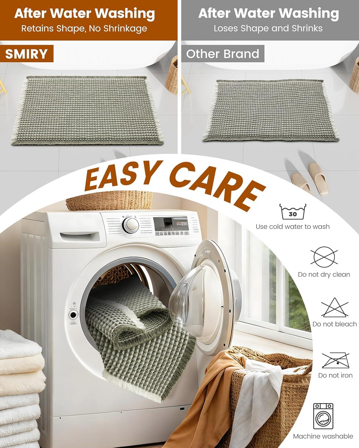 [Easy to Clean & Care] Machine wash on a gentle cycle with cold water for the best. After cleaning, air dry naturally or tumble dry on low heat. For simple daily maintenance, just shake the bath rugs by hand to remove dust, which will help maintain its non-slip properties.