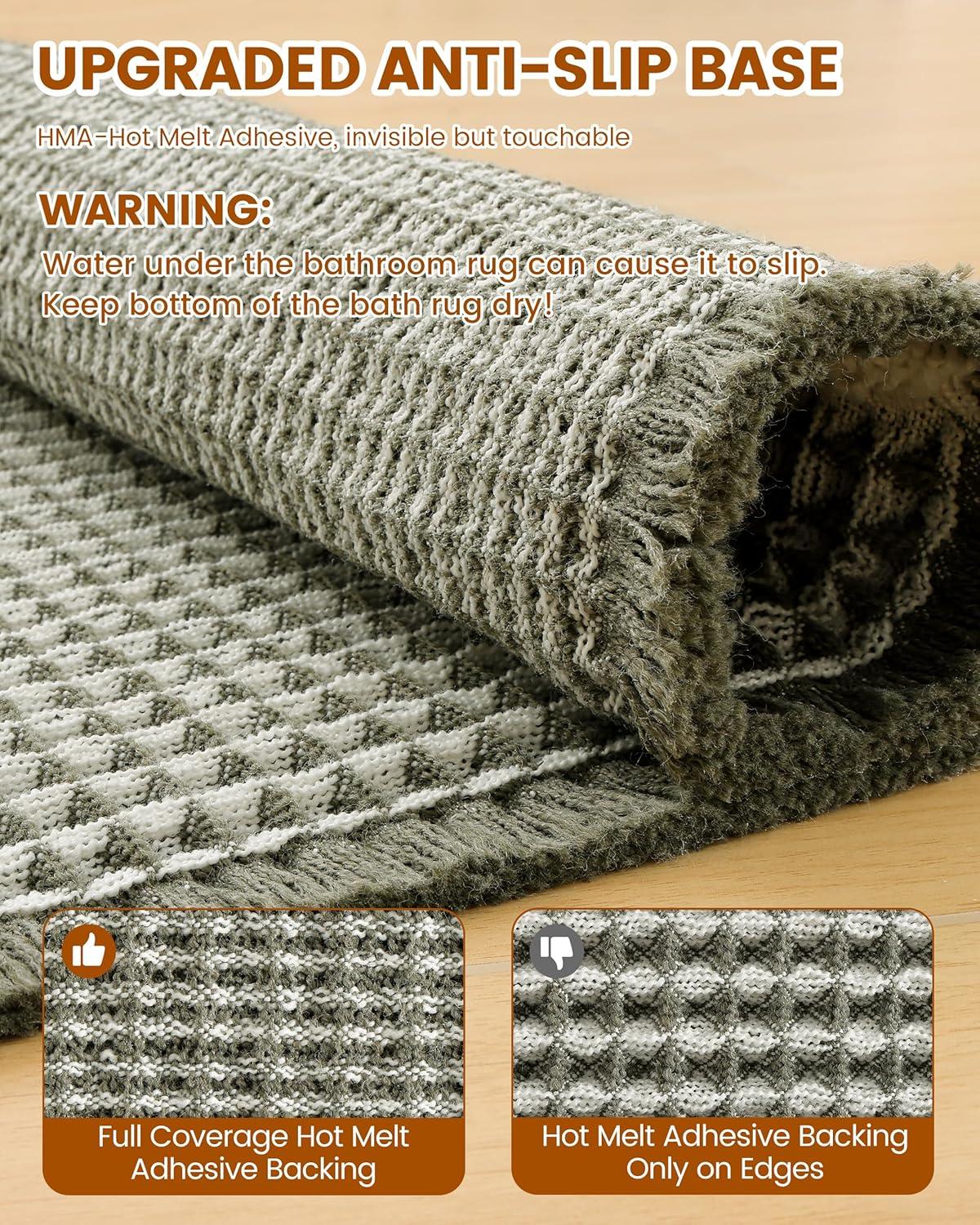 [Non-Slip Backing] The full-coverage hot melt adhesive backing on the bottom of the bathroom mat eliminates slipping risks through complete surface adhesion, keeps the mat flat without shifting, and evenly distributes pressure to reduce backing wear—combining safety protection, stable usability, and long-lasting performance in one.WARNING: Water under the bathroom rug can cause it to slip. Keep bottom of the bath rug dry!