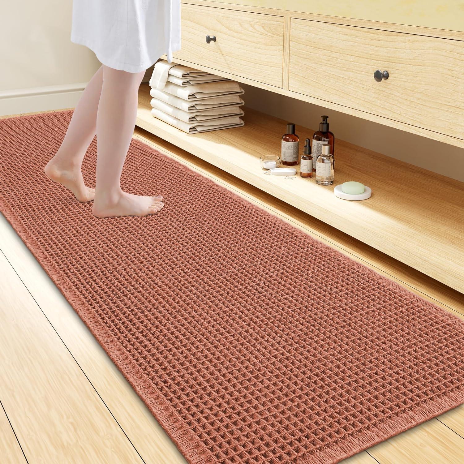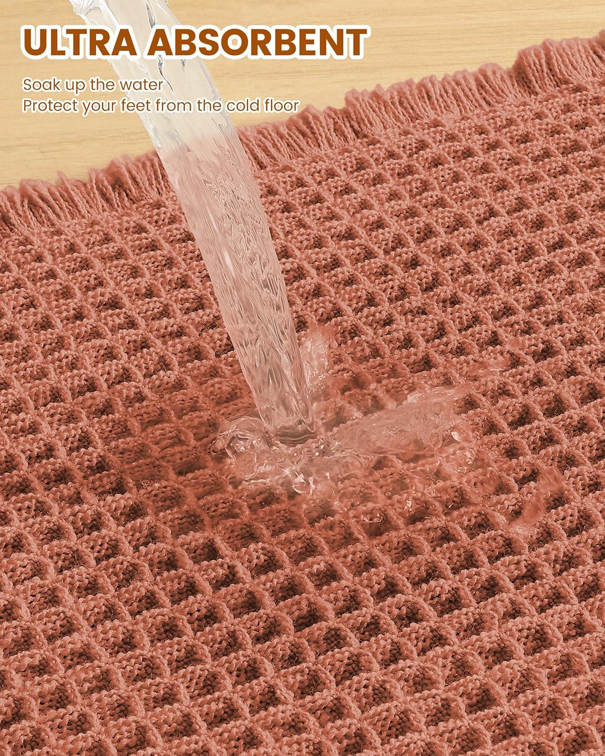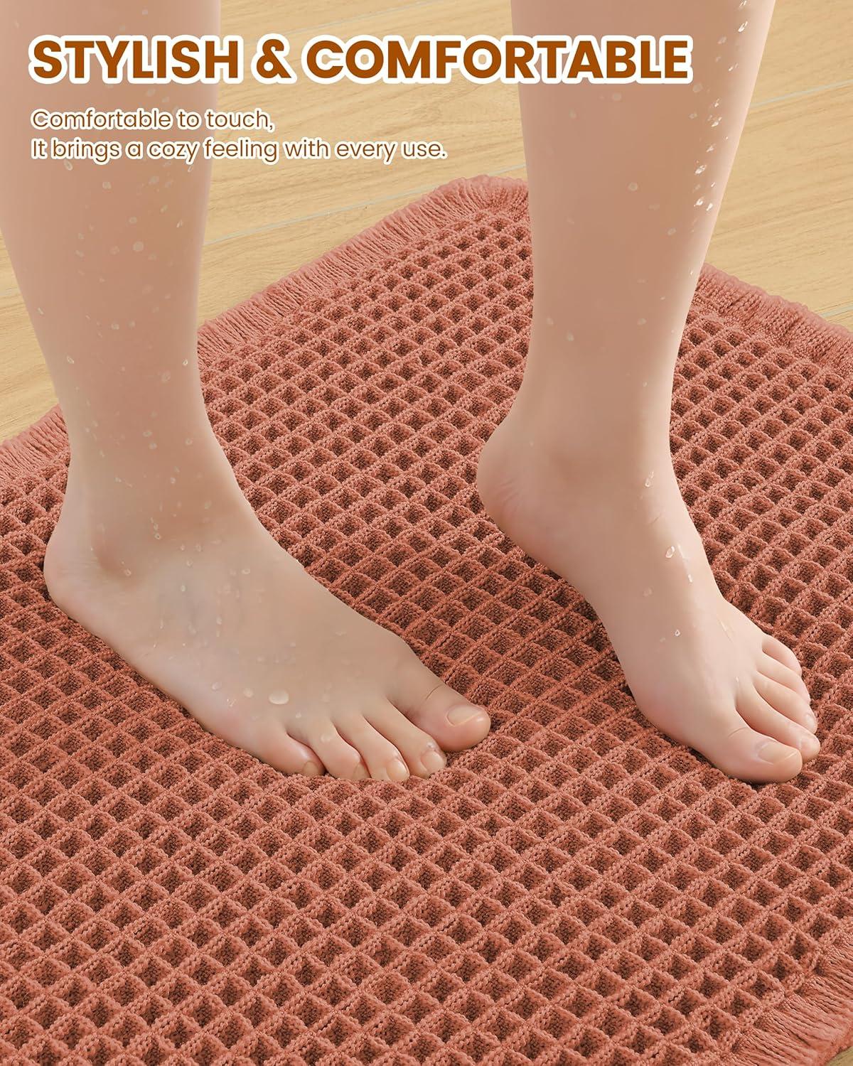 [Soft & Comfortable] The moment you step on the bathroom rugs, the solid thickness of the high-weight material is instantly felt—no flimsy lightness, only steady and comfortable support. The three-dimensional waffle texture fits naturally with every movement of your feet, gently wrapping every inch of your soles, making every step both stable and utterly cozy.
