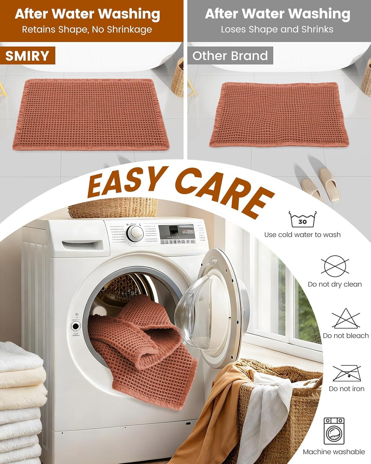 [Easy to Clean & Care] Machine wash on a gentle cycle with cold water for the best. After cleaning, air dry naturally or tumble dry on low heat. For simple daily maintenance, just shake the bath rugs by hand to remove dust, which will help maintain its non-slip properties.
