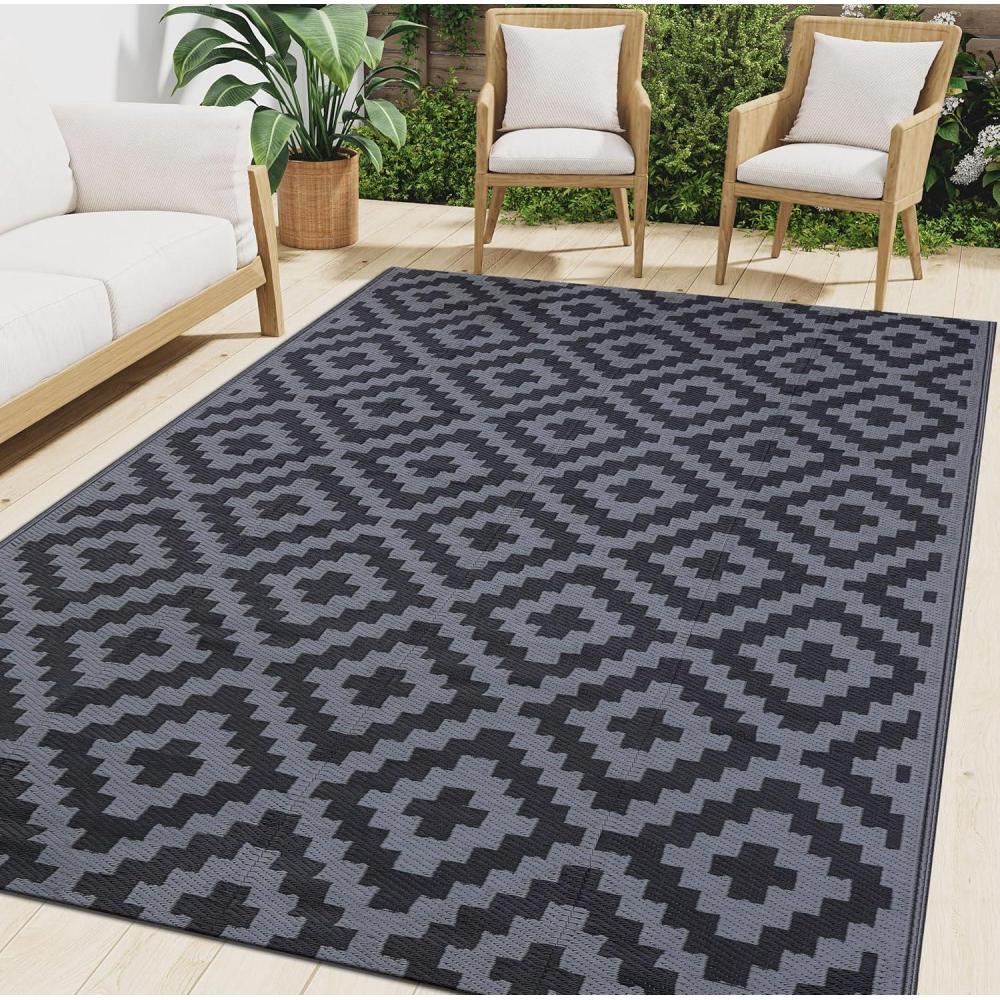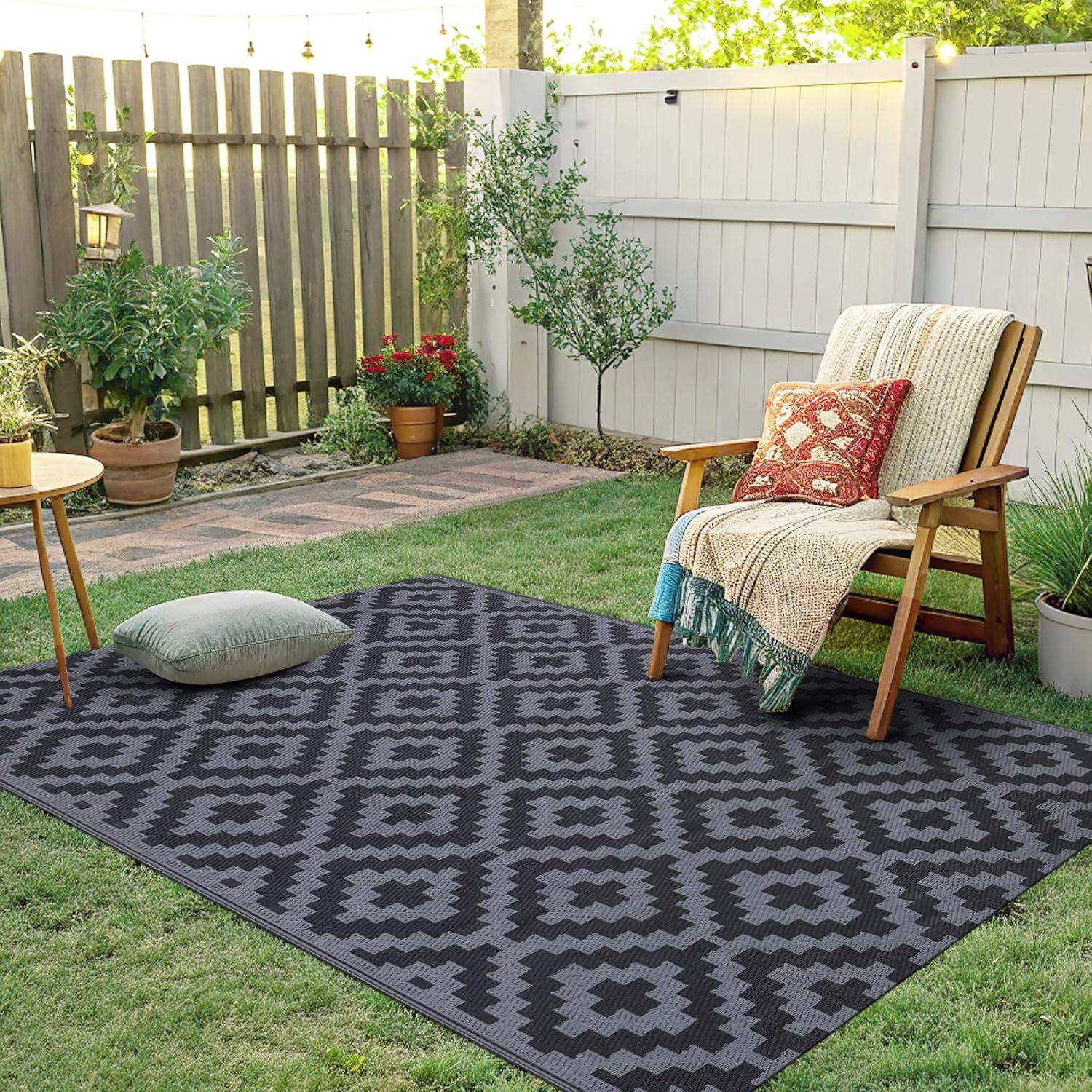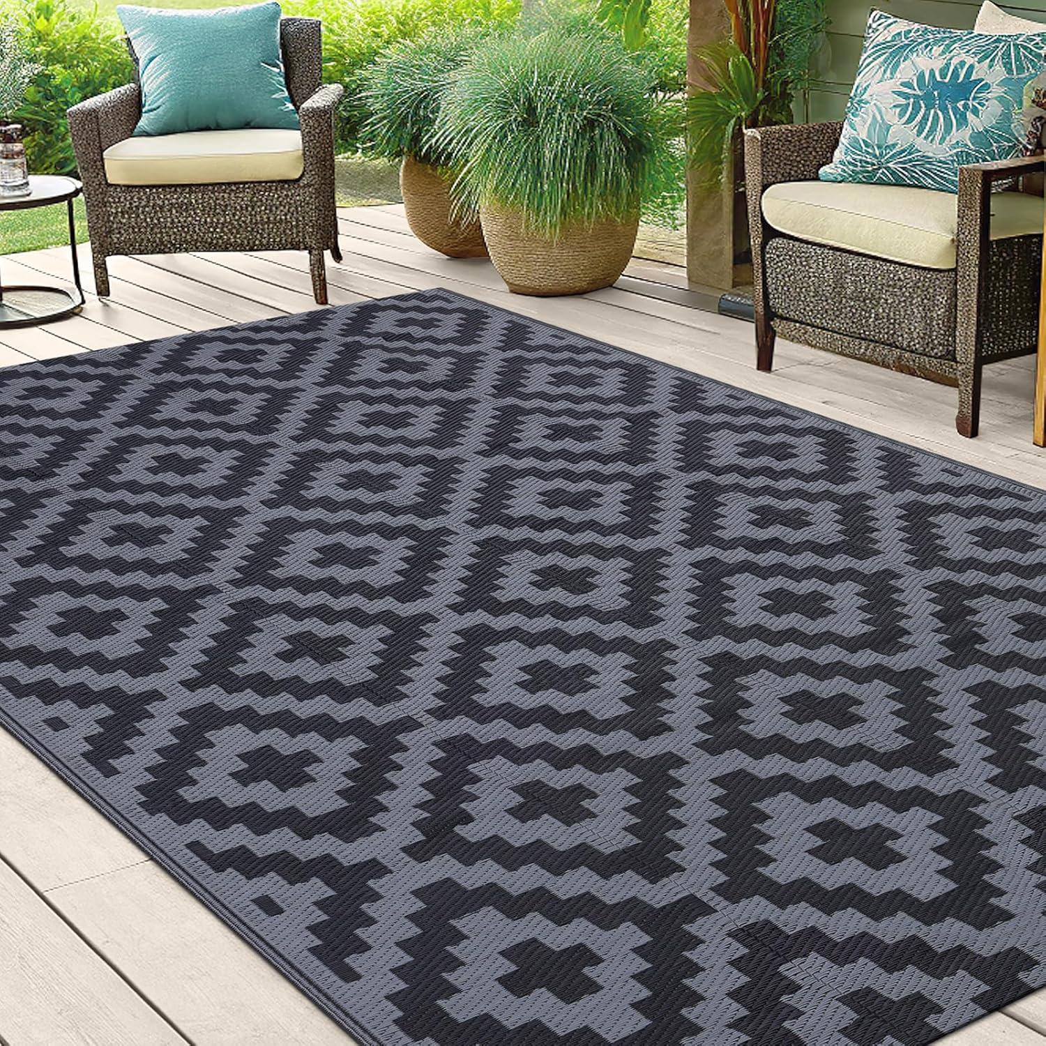 Smiry Waterproof Outdoor Rug 5x8 ft, Reversible Plastic Straw Patio Camping Rugs, Outdoor Indoor RV Mat Carpet for Patio, Outside Entry, Backyard, Deck, Bench, Picnic, Camper, Black & White(Black and Grey)