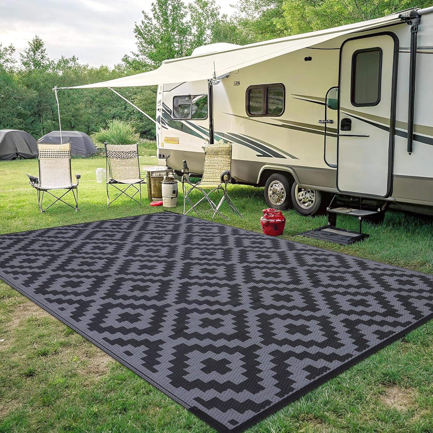 Smiry Waterproof Outdoor Rug 5×8 ft, Reversible Plastic Straw Patio Camping Rugs, Outdoor Indoor RV Mat Carpet for Patio, Outside Entry, Backyard, Deck, Bench, Picnic, Camper, Black & White(Black and Grey)
