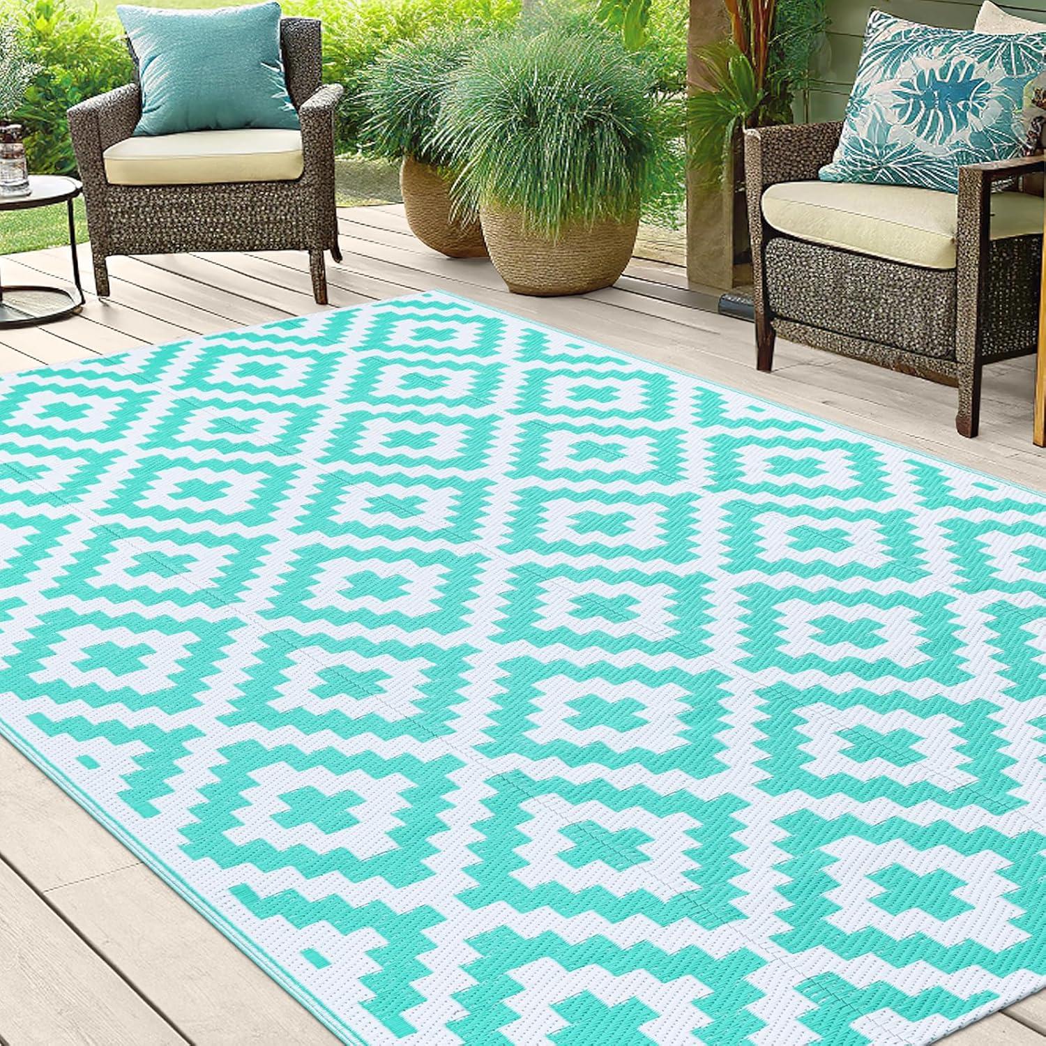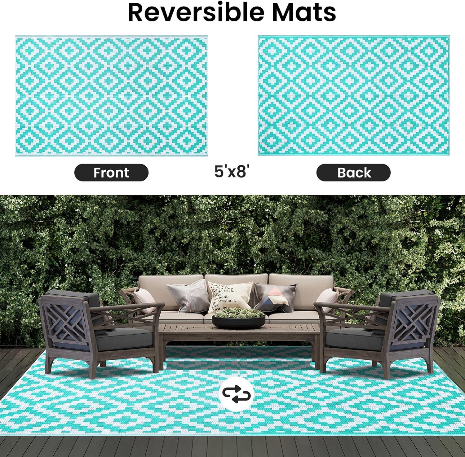 Smiry Waterproof Outdoor Rug 5×8 ft, Reversible Plastic Straw Patio Camping Rugs, Outdoor Indoor RV Mat Carpet for Patio, Outside Entry, Backyard, Deck, Bench, Picnic, Camper, Black & White(White and Teal)