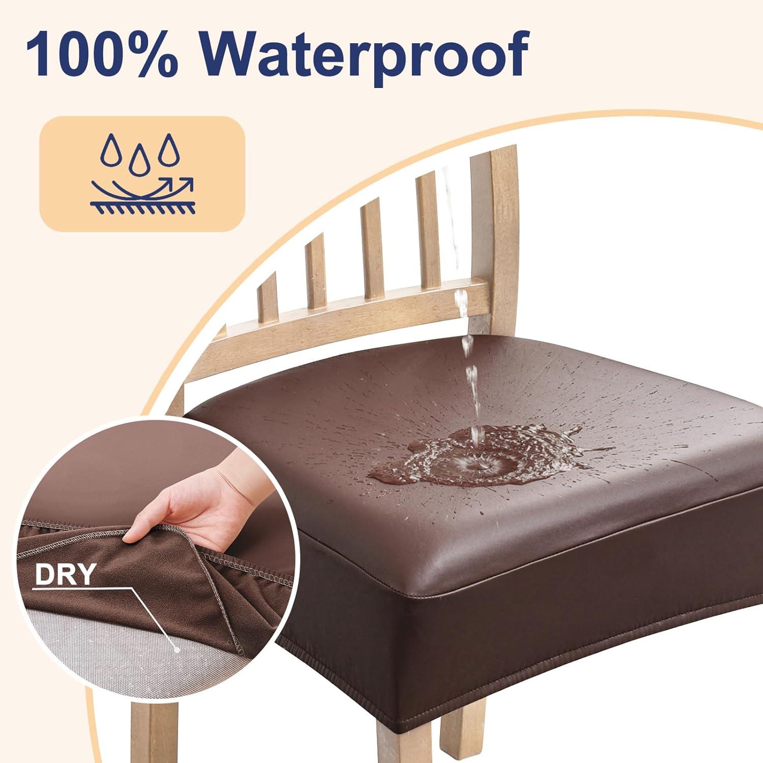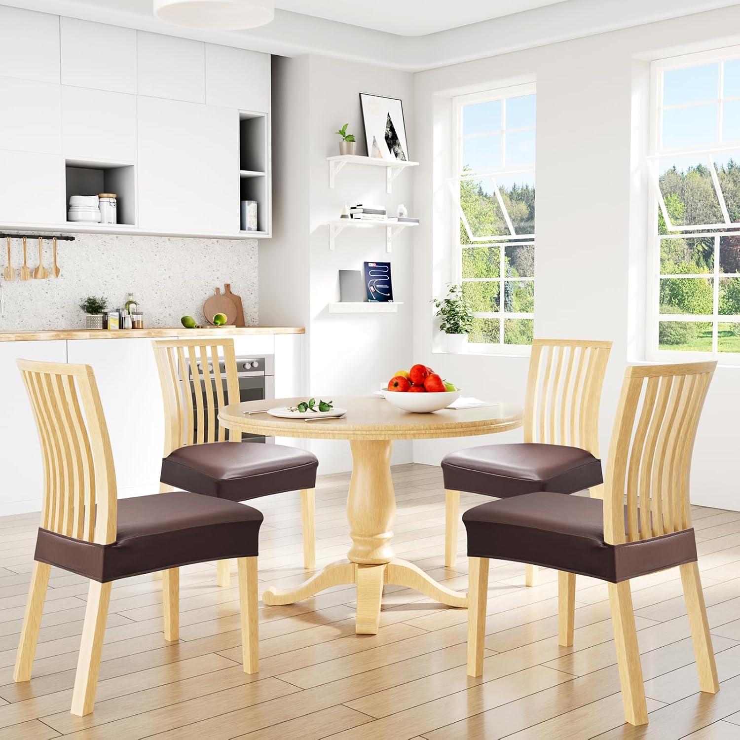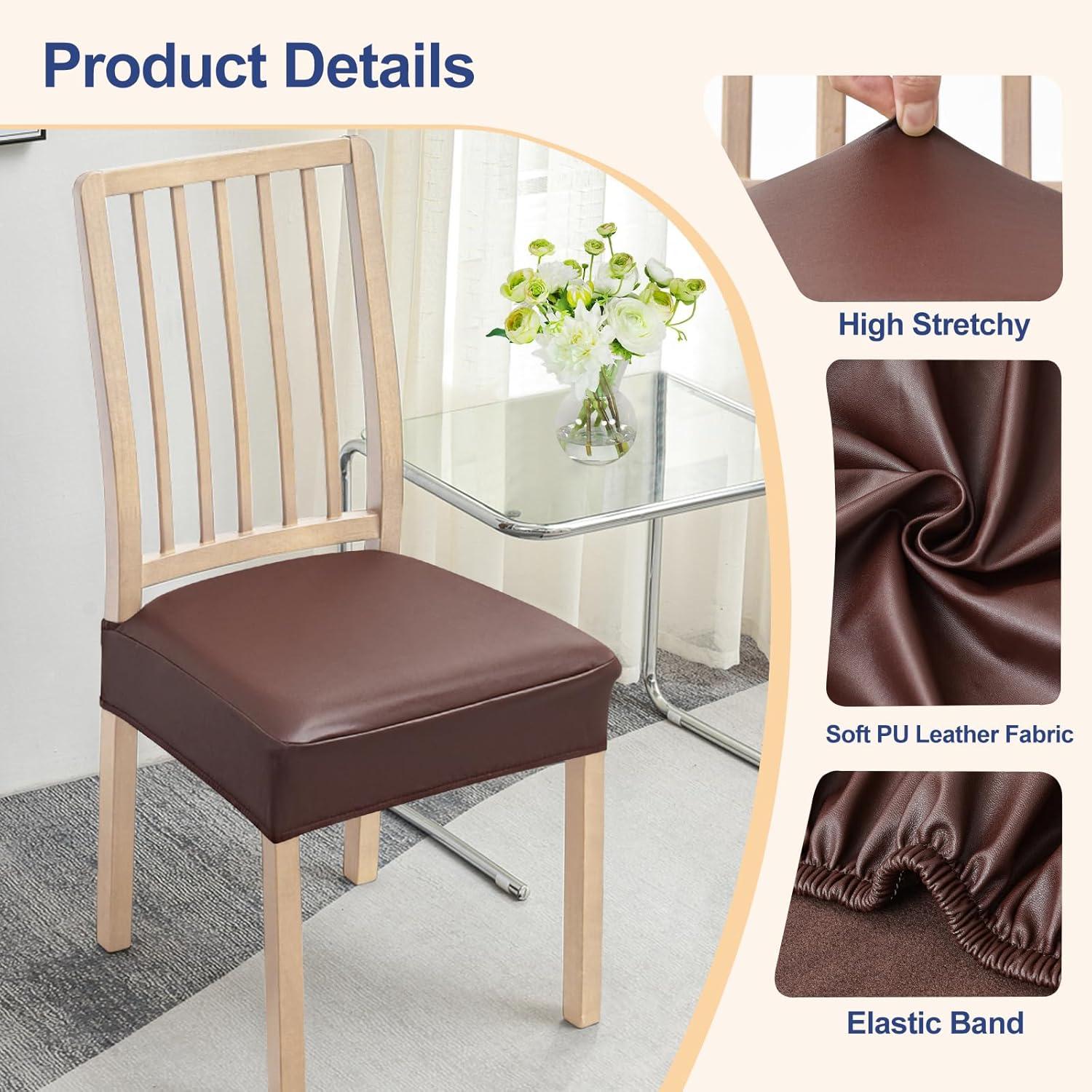 Smiry Waterproof Seat Covers for Chairs Set of 4, Stretch Pu Leather Removable Washable Dining Room Chair Seat Slipcovers Protector, No Rear Covers, Beige(Coffee)