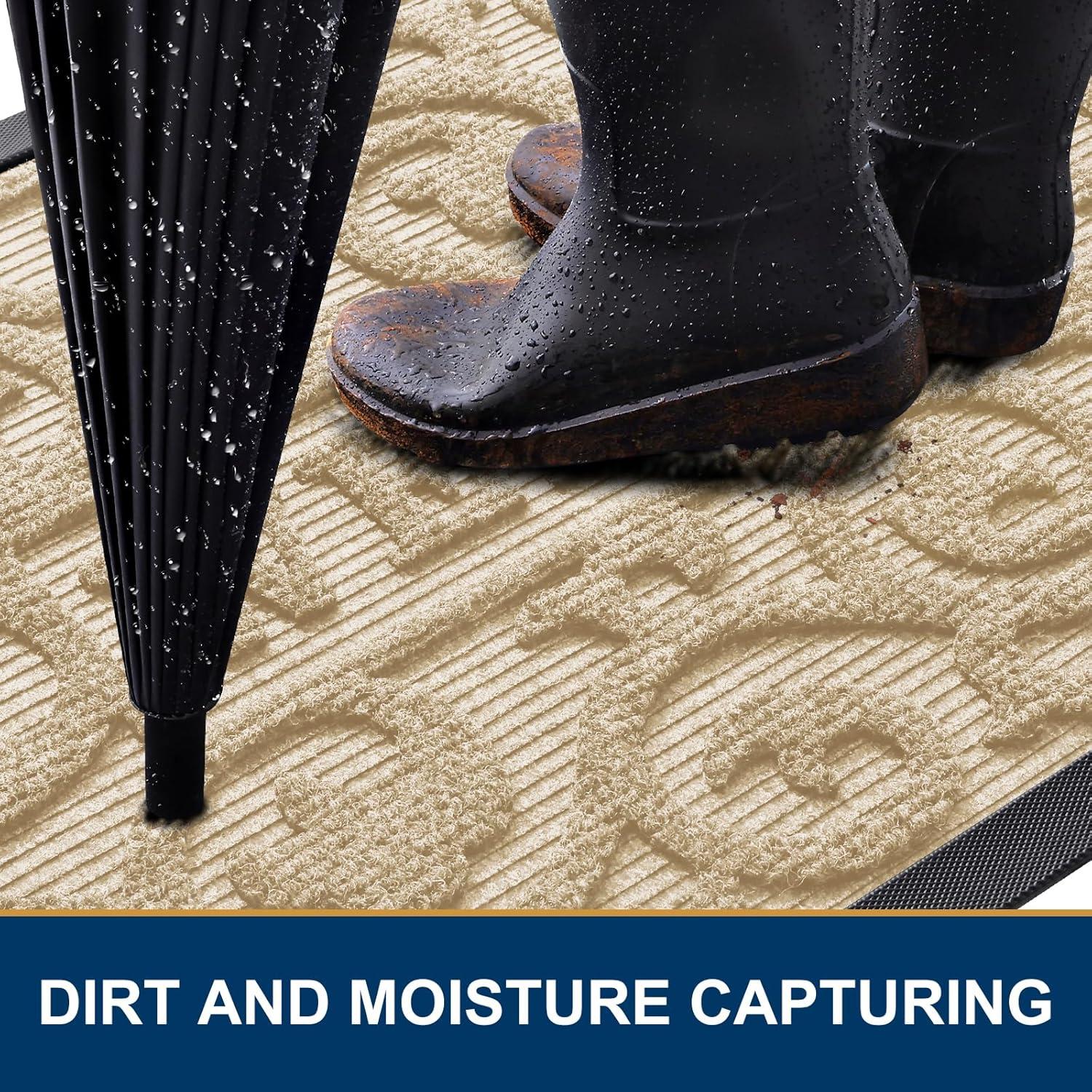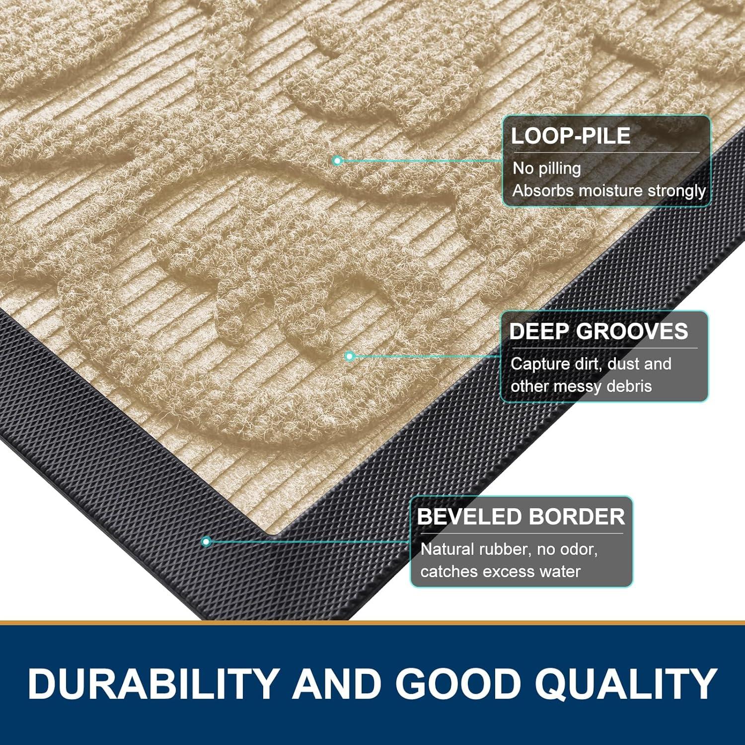 【Moisture & Dirt Absorbent】: The surface of the Smiry door mat is made of woven polyester fabric. The deep grooves can effectively trap the dust, gravel, mud, sand and other clutter. The sturdy beveled rubber edge will not accumulate water. Even rainy, snowy or muddy weather will keep your home dry and clean.